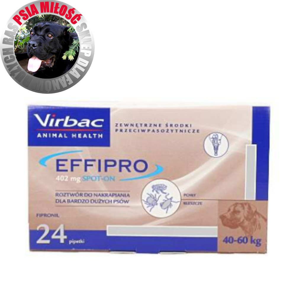 EFFIPRO Spot‑On XL to weterynaryjny preparat przeciwpasożytniczy firmy Virbac, przeznaczony dla psów bardzo dużych o masie 40–60 kg. Każde opakowanie zawiera 24 pipety po 4,02 ml