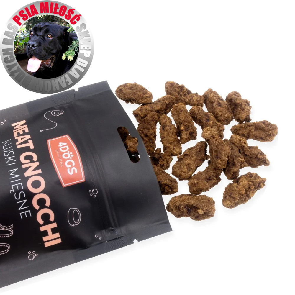 4Dogs Mięsne Kluski z Wołowiną i Porożem Jelenia to wysokomięsne, aromatyczne przysmaki stworzone z myślą o psach, które kochają intensywny smak i naturalne składniki.