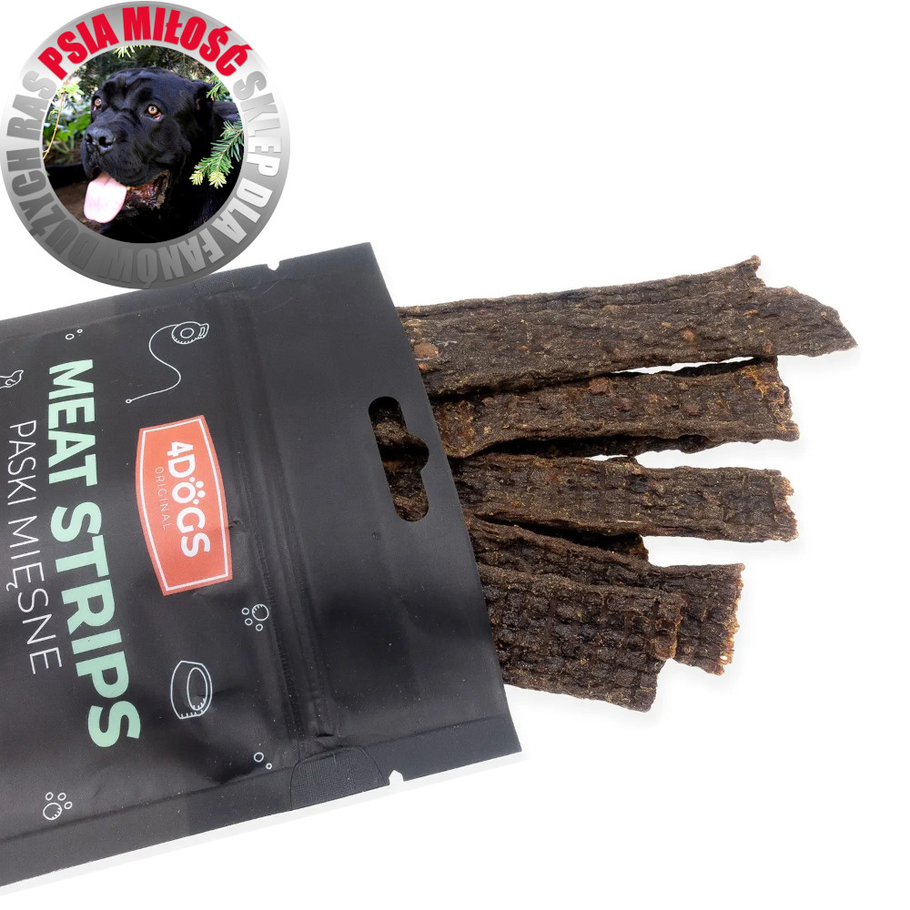 4Dogs Mięsne Paski z Dziczyzny i Poroża Jelenia to wysokomięsny, intensywnie aromatyczny przysmak dla psów, stworzony z myślą o naturalnym żywieniu i wyjątkowym smaku.