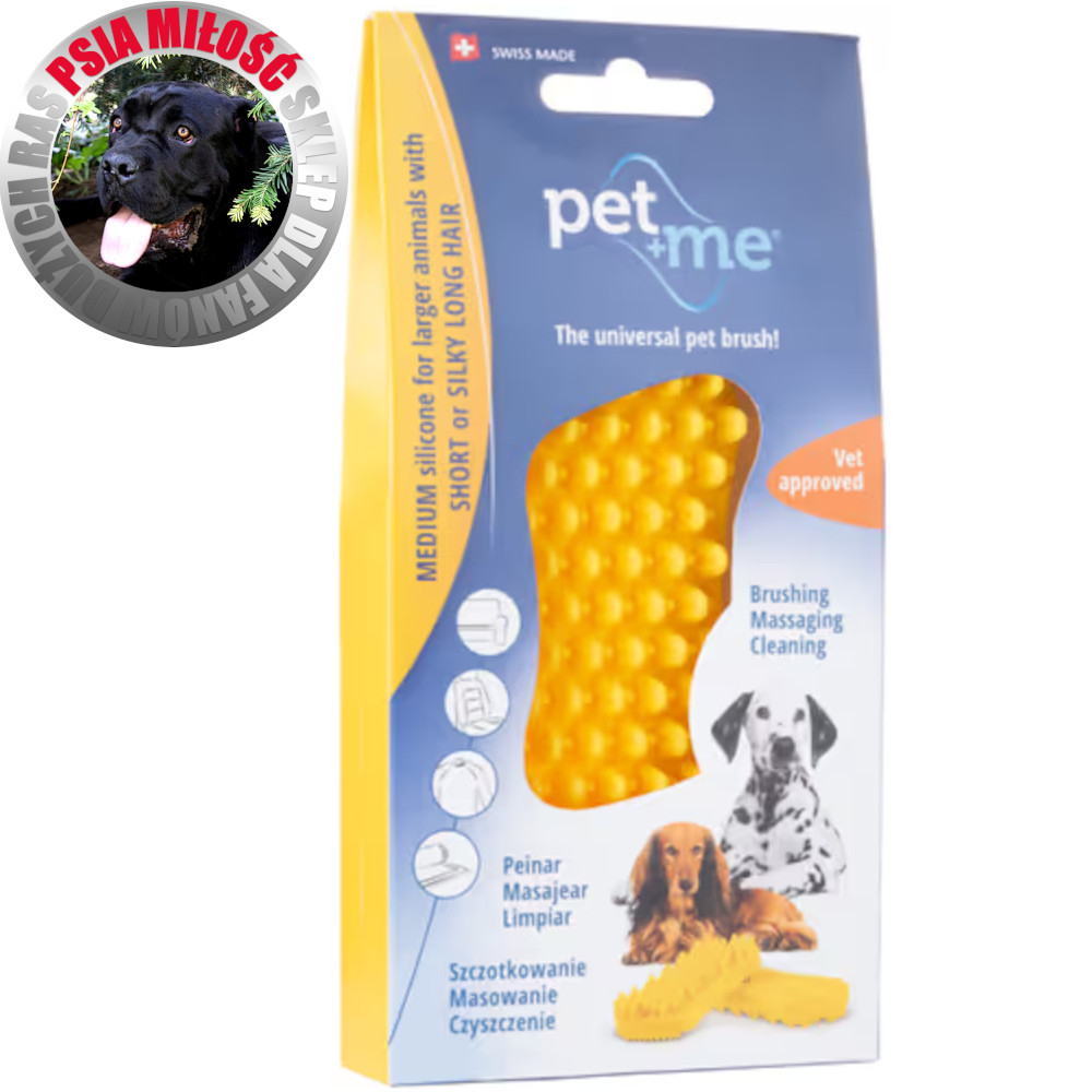 Pet+Me Medium Silicone Brush Yellow to oryginalna, szwajcarska szczotka wykonana w 100% z silikonu medycznego, całkowicie bezpiecznego dla zwierząt i ludzi. Model Medium Yellow jest przeznaczony dla psów o krótkiej, gęstej, kręconej, jedwabistej lub szorstkiej sierści — czyli dla większości ras krótkowłosych i szorstkowłosych, a także psów z miękkim podszerstkiem.
