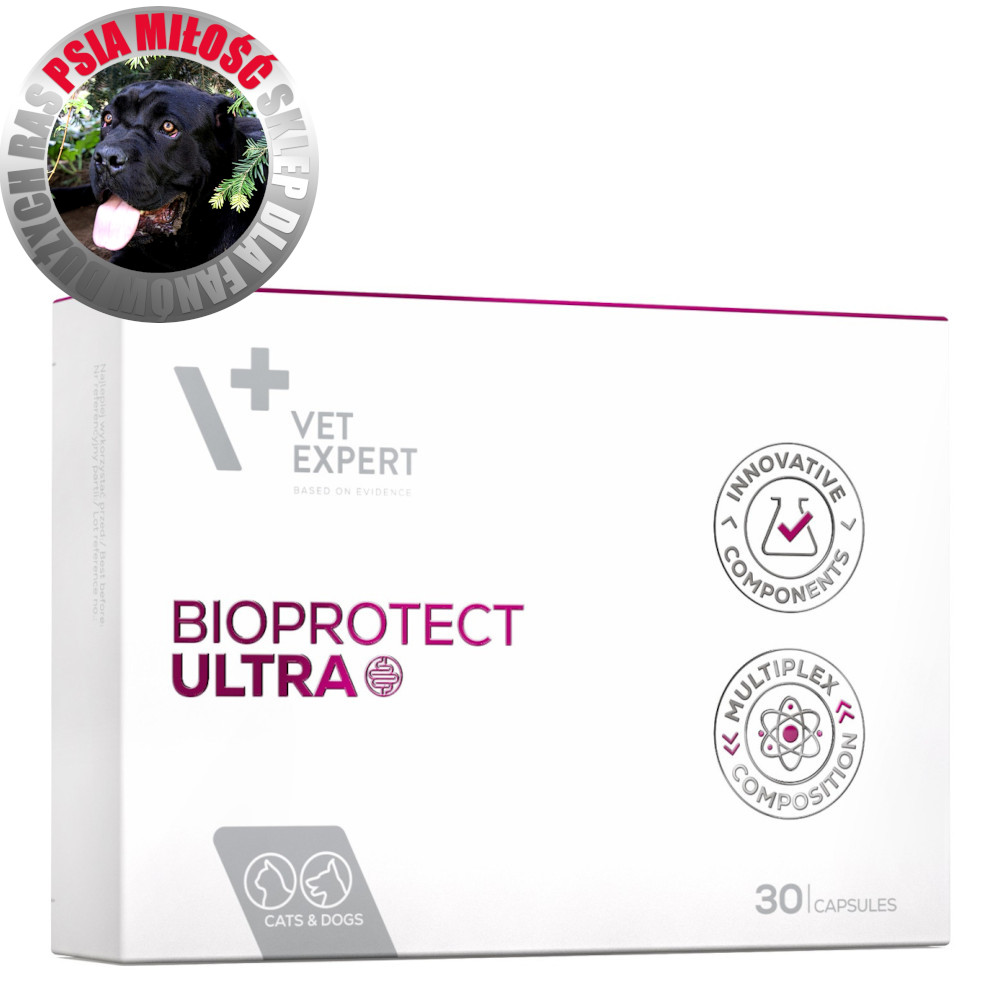 VetExpert BioProtect Ultra 30 kapsułek to zaawansowany probiotyk dla psów i kotów – łączy działanie pro-, pre- i postbiotyków, wspierając mikroflorę jelitową, odporność oraz procesy trawienne.